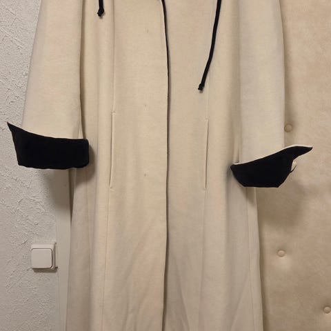 Musta, reisipituinen, pitkät hihat ja syvät sivutaskut. Korkea ja leveä näyttävä kaulus, joka käännettävissä myös hupuksi. Erittäin lämmin takki.