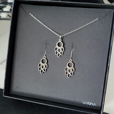 Lumoava taika korusetti mihin kuuluu roikkuvat korvakorut ja iso riipus pitkällä (n.85cm) ketjulla. Setin ovh n.350€