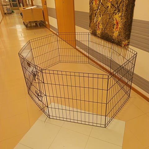 Metallinen musta pentuaitaus, koostuu kahdeksasta toisiinsa liitetystä osasta (K. 75cm, L: 62cm). Yhdessä osassa erillinen "ovi". Meillä ollut käytössä pennulla. Materiaali on kestävä metalli, ja rakenne on kevyt siirrettäväksi sisällä tai ulkona. Aitauksen saa kätevästi avattua yhdeksi pitkäksi aidaksi ja taiteltua kokoon. Yksi kolmesta kiinnityshakasesta puuttuu, mutta ei ole haitannut käyttöä.