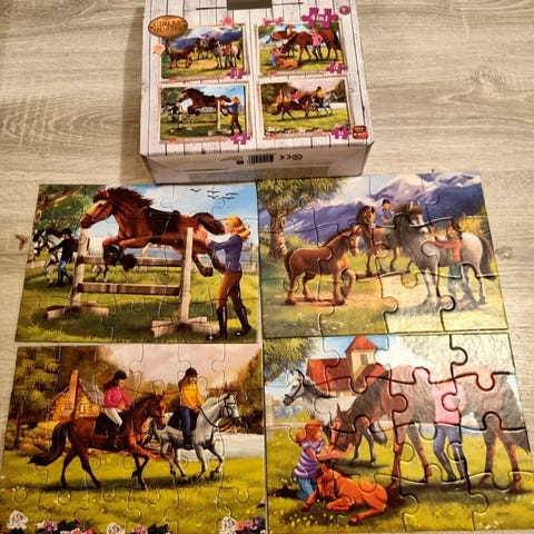 Girls & Horses 4-in-1 Hevospalapeli sisältää neljä erilaista hevosteemaista palapeliä, jotka koostuvat useista palasista. Sopii lapsille ja tarjoaa monipuolista tekemistä hevosharrastuksesta kiinnostuneille.