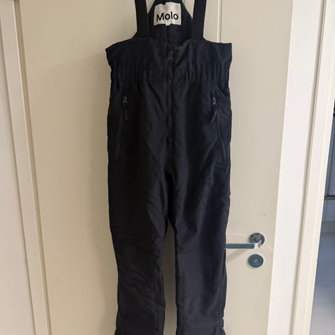 Kahtena vuotena laskettelussa käytössä olleet Molon henkselihousut / toppahousut. Hyvässä kunnossa mutta toisessa polvessa vähän kulumaa, joka kuvassa. Unohtuneet vaatevarastoon pariksi vuodeksi käytön jälkeen mutta edelleen hyvät housut seuraavalle. Sopii niin tytölle kuin pojalle. Kiva ja käytännöllinen heijastintähti lahkeessa.