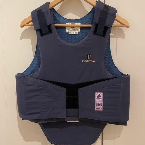 Treadstone CP XL RL ratsastusliivi, jossa on kehon ja hartioiden suojaus. Väri musta ja sininen. Valmistettu materiaaleista, jotka täyttävät EN 13158 ja BETA 2000 -standardit. Sopii suojaamaan kehoa ja hartioita rastastuksessa.