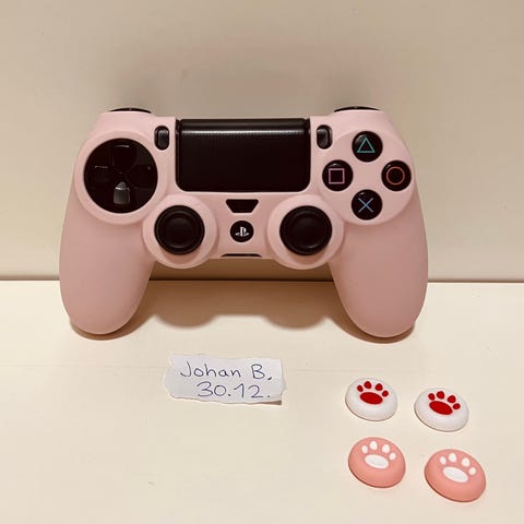 Ohjaimen päällä on violetti silikonikuori, jonka saa helposti myös irrotettua. Kaupan päälle kaksi paria tattien päälle tulevia kumisuojia tassukuvioilla.