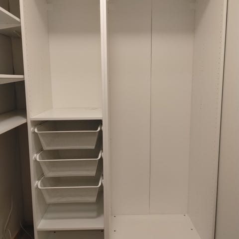 Korkea ja leveä hyllykkö, paljon vetolaatikoita/vedettäviä koreja ja säilytystasoja. Erittäin hyvä valinta esim. vaatehuoneeseen. Hyllykkö on jaettavissa tarvittaessa kahteen osaan. Hyväkuntoinen.