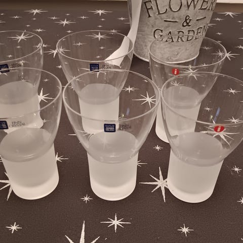 Lasit käyttämättömiä, vitriinissä vuosikausia. Kunto hyvä, saattaa löytyä jokunen pieni jälki, olleet parilla kirpparilla myynnissä.