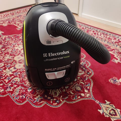 Electrolux UltraOne pölynimuri, jossa on harmaa ja oranssi väritys. Imuri toimii pienellä teholla tai isolla teholla hetken aikaan. Veikkaisin, että lämpösuoja hajalla myydään siis korjattavaksi