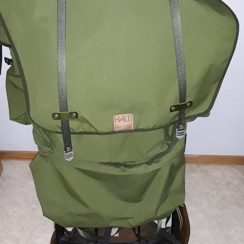 Kaksi vetoketjutaskua sivulla ja pikkutasku pääliläpässä . Pohja avattava. Lenkkejä ym. rinkan ulkopuolisen tavaran kiinnittämiseen Leveä lannevyö. Vihreä väri.
