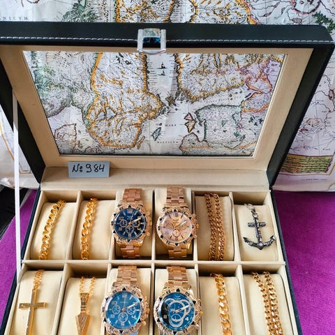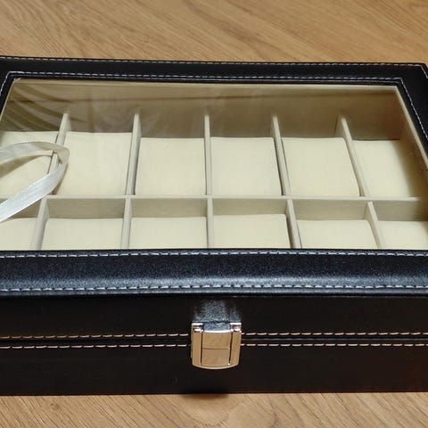 Laatikko 12 kellolle mitat 30x20x8 cm pienet taskut 92 45x42 mm materiaali mdf levy pu-nahka sisusta tekomokkaa sopii myös koruille ristikot irrotettavissa rekvisiitta ei tule matkaan toimitus 8€