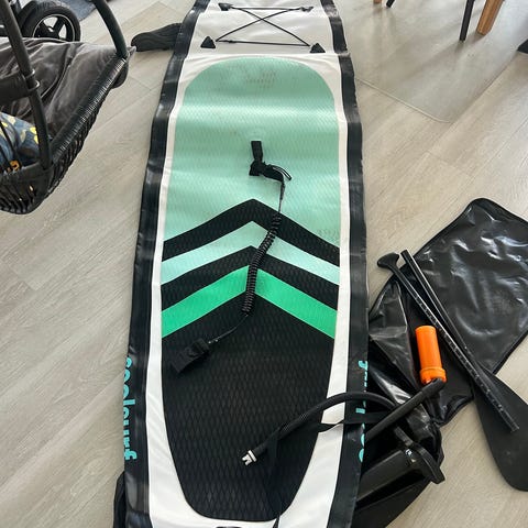 Muutamia kertoja käytetty SUP-lauta. Ostettu 4 vuotta sitten, eli viettänyt varastossa suurimman osan ajasta. Hyvässä kunnossa, ei vuotoja. Mukana tottakai pumppu, mela, jalkahihna sekä kaksi evää. Pituus noin 317 cm. Alkuperäinen hinta 200 € mikä oli silloinkin alennushinta, eli lähtee nyt halvalla. Pakkautuu kätevästi kuvassa olevaan "reppuun"