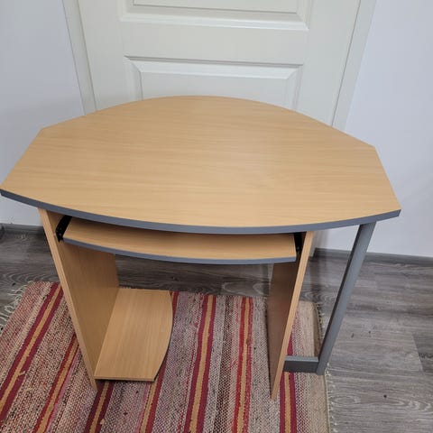Annetaan puinen tietokonepöytä. Käytön jälkeä löytyy, mutta ehjä kaikin puolin. Näppärä fiksaa itselleen mieluisan.