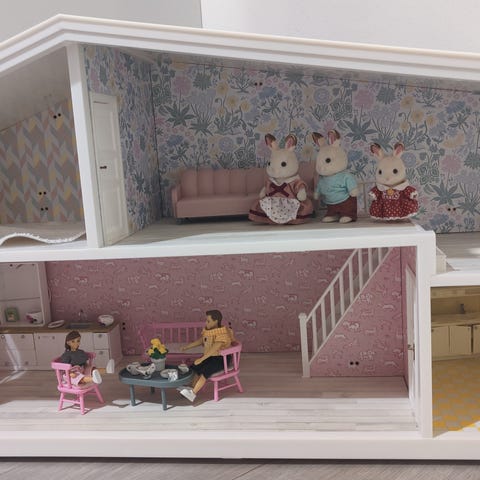 Myydään jo useamman vuoden leikeissä ollut, mutta hyväkuntoinen, kaksiosainen ja 3 kerroksinen Lundby- nukkeatalo kuvissa olevine kalusteineen ja hahmoineen. Mukana myös muutamia Sylvanian Families pupu ja kaluste. Valot talossa toimii.