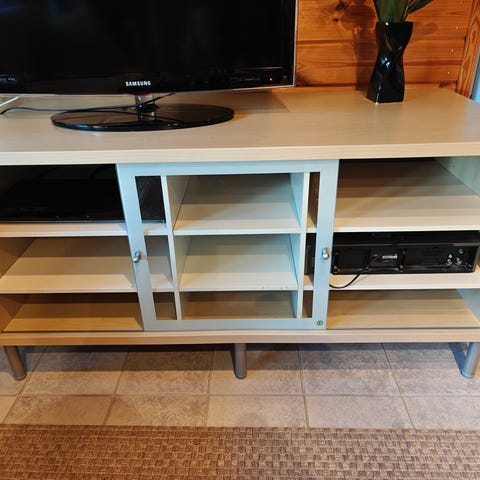 TV-taso, jossa on lasiovi, avoin hylly.ja yksi laatikko. Tukeva ja laadukas. Pieni naarmu pinnassa (kuva 2, hädin tuskin näkyvä).