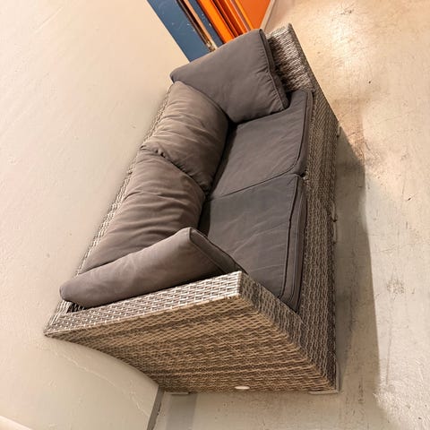 Siistissä käytetyssä kunnossa, talvet säilytetty varastossa. Päälliset pestävissä, neljä tyynyä kuuluu kauppaan kuvasta poiketen. Jämäkkää kangasta, kestää hieman sadetta ennenkun menee vesi läpi.