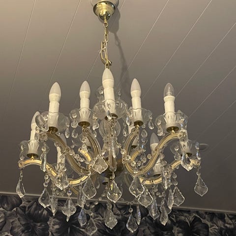 Kaunis vintage kristallikruunu Palwan kolmella polttimolla. Kaikki Kristallit tallella. Sopivan siro vaikka kylpyhuoneeseen, pieneen makuuhuoneeseen tai eteistilaan katseenvangitsijaksi.