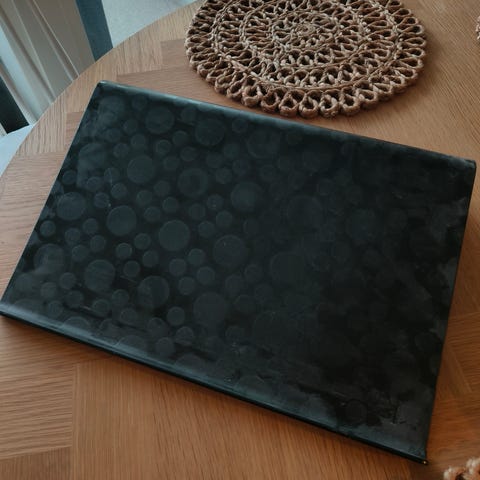Väri: musta. Täysin ehjä. Edestä 25 cm pitkä ja sivusta sivuin 48cm.