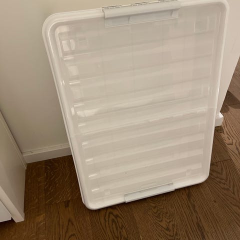 Kestävä laatikko on valmistettu kierrätetystä muovista, jonka vaalea väri sopii monenlaiseen sisustukseen. Läpinäkyvän kannen ansiosta näet aina mitä laatikossa on ja löydät haluamasi. Vahvat sulkijat pitävät kannen tiiviisti paikoillaan. Laatikon syvyys on 79 cm, leveys 59 cm ja korkeus 17,5 cm. Korkeus renkaiden kanssa 18,5 cm.