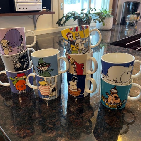 Kaksi uuden veroista japanin markkinoille tehtyä sydämen mallista muumimukia; Nuuskamuikkunen ja Pikku Myy.