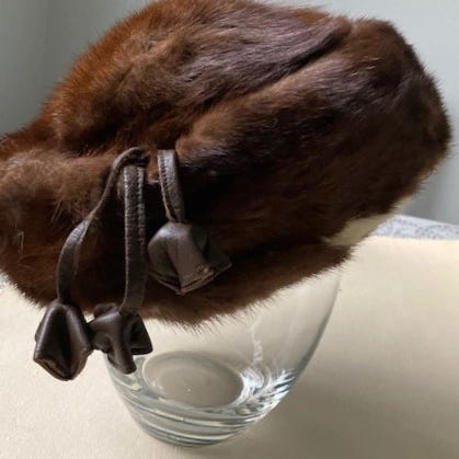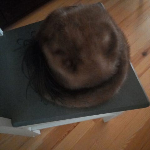 Hyväkuntoinen tummanruskea minkkihattu, häntä - ja päälliskoristeinen, päänympärys 55 cm