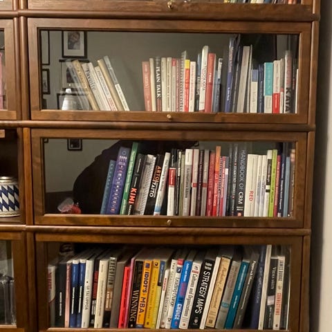 2 kpl Boknäs-hyllyjä: viisi kpl vitriinejä lasiovella (korkeus ja syvyys 31 cm), yläsokkeli (syvyys 31 cm), salasokkeli (syvyys 39 cm), korkea (47 cm) mappivitriini umpiovella.