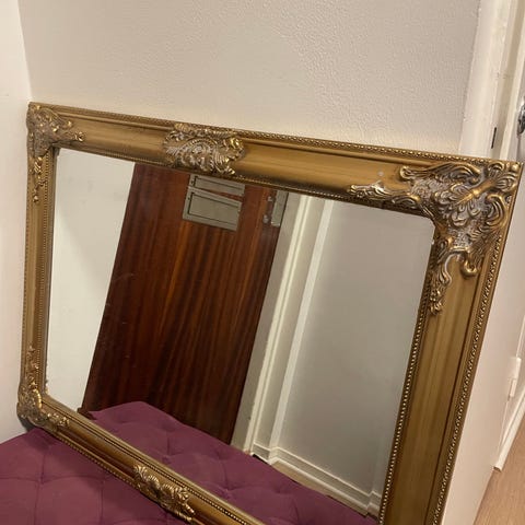 Annan pois peilin, jossa on kultaiset kehykset. Itse peili on hyvässä kunnossa, mutta kehys on rikki – sen saa kyllä korjattua vasaralla ja pienillä nauloilla.