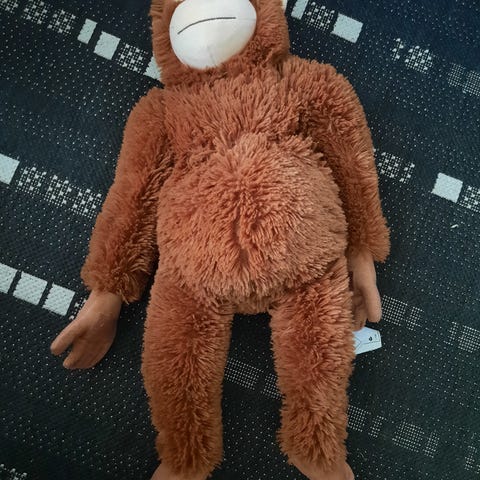Hyväkuntoinen Ikea pehmolelu. Ei aivan niin täyteläisen oloinen kaupasta ostettuun verrattuna, mutta hoitaa hommansa hyvin.