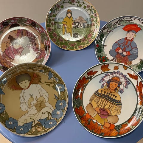 Kahdeksankulmainen vanha seinälautanen. Reunassa on ohut kultainen reunus.Lautasessa on tyypillinen hollantilainen maaseutumaisema, jossa on tuulimyllyjä, vesistö, veneileviä ihmisiä ja perinteisiin asuihin pukeutunut nainen etualalla. Halkaisija 30 cm.