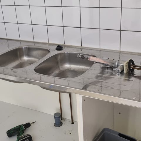 Tiskipöytä ja hana. Taso on vanha joten käytön jälkeä varmasti on, mutta ehjä eikä mitään suurempaa jälkeä ole. Hana on joskus vähän tiputtanut liitoksistaan mutta ei jatkuvasti. Molemmat suoraan käytöstä eli sillä tavalla ovat ihan käyttökelpoisia.