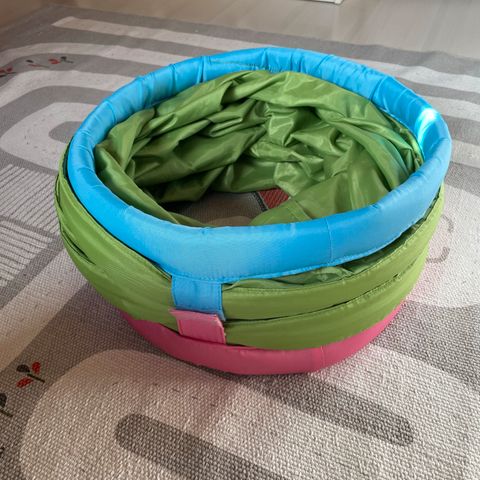 Lasten leikkeihin kokoontaitettava tunneli. Vähän jo käytön jälkiä, mutta toimiva lelu silti.