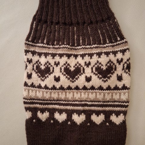7-veljestä langasta käsin neulottu villapaita koiralle. Ympärysmitta n.50cm, pituus niskasta n.40cm ja lisäksi kaulus n.12cm. Etutassujen väli n.12cm.