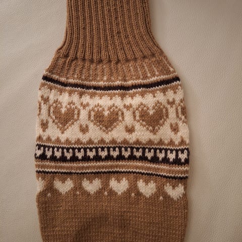 7-veljestä langasta käsin neulottu villapaita koiralle. Ympärysmitta n.50cm, pituus niskasta n.40cm ja lisäksi kaulus n.12cm. Etutassujen väli n.12cm.
