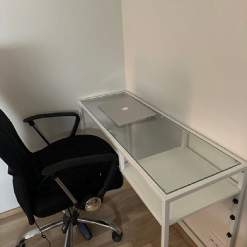 Valkoisella metallikehyksellä, lasinen pöytälevy. Lasin pinnassa pientä naarmuja ja tahraa käytön jäljiltä.