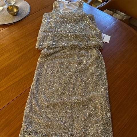 Upea Lili Marleenan hopeinen paljettimekko. Suomessa valmistettu luxus ylijäämäkankaista. Medium pituus. Yhden koon mekko. Käy XS-XL kokoisille.