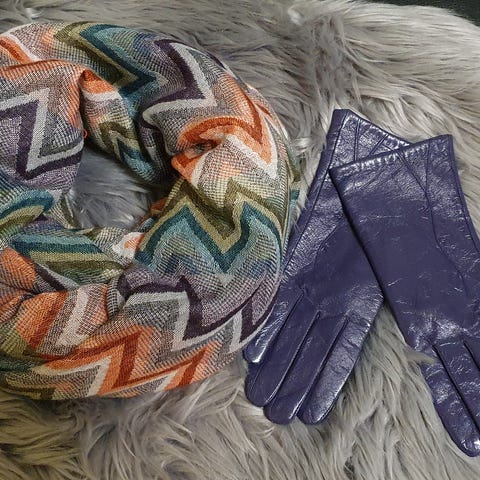 Myytävänä kaulahuivi ja käyttämättömät nahkakäsineet.