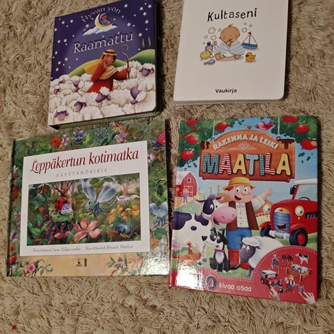 Kokoelma lastenkirjoja eri kirjoittajilta. Kirjat sisältävät erilaisia tarinoita ja kuvituksia, sopivia lapsille. Kirjojen koko, väri ja materiaali vaihtelevat.