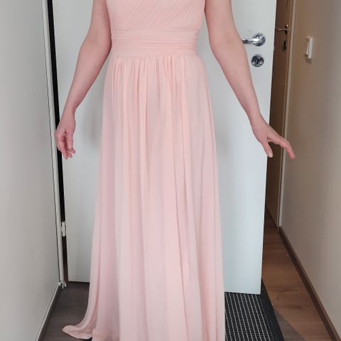 Myydään kerran käytetty Eva & Lola merkkinen morsiusneidon mekko / iltapuku. Koko M, mutta selkämys joustavaa neulosta, joten sopii hyvin monenkokoiselle henkilölle. Pituus sovitettu korkoineen noin 176-senttiselle. Lilaan taittava vaaleanpunainen, todellinen väri näkyy parhaiten ulkona otetussa kuvassa. En löytänyt moitteita kunnossa. Pesty hajusteettomasti. Nouto Kaijanlampi tai toridiili.