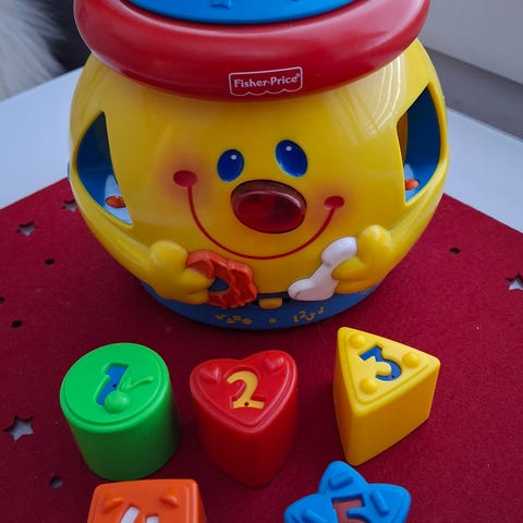 Fischer-Pricen iloisen värinen palikoiden pujottelun purkki, jossa on pellen naama ja pattereilla toimivat äänet ja valot. Purkki kehuu iloisella äänellä, kun taapero saa purkkiin oikeat palikat pudotettua. Uutta vastaavassa kunnossa. Myynnissä Lohjalla, mutta kulkeutuu omien menojen mukaan Kamppiin. Hp. 20 euroa