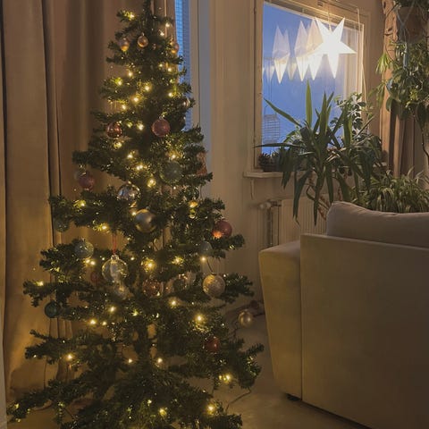 Rustan 2v vanha joulukuusi, jossa ledvalot.