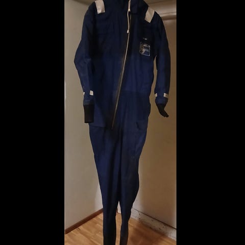 Puku on kokoa L. Huomioi että puku on valmistettu 1994, ollut vuosia käyttämättä mutta nyt kokeiltaessa kuitenkin edelleen vesitiivis ja vetoketju toimii hyvin. Kiinteä strech-huppu ja joustava kaulamansetti.