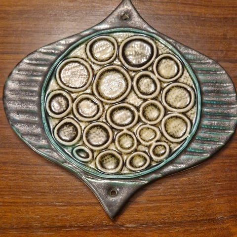 Kuvataiteilija Eila Pilvenpalon tekemä kaunis kasvoreliefi. Takana paperilappu, jossa ilmeisesti latinankielistä tekstiä- sekä teoksen nimi Mielentyyneys. Eila Pilvenpalo.