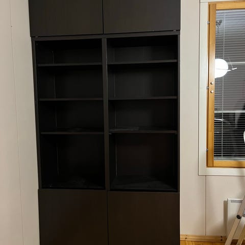 Siistikuntoinen 40 cm leveä ovellinen Ikean Billy -hyllykkö. Korkeutta on 237 cm, syvyys 30 cm. Yläkaapin perällä reikä, että voi tarvittaessa porata seinään turvaruuvin ja alaosassa jalkalistaa varten kolonen, että menee ihan seinään kiinni.