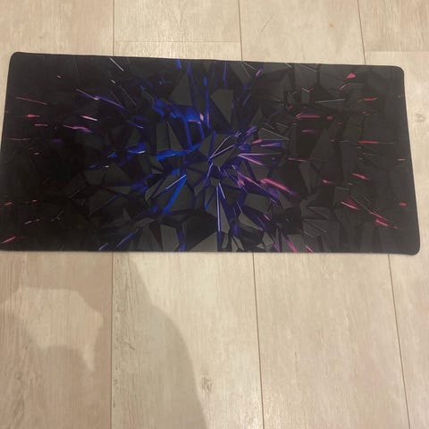 Musta pelihiiri matto joka on melkein käyttämätön ja ei mitään jälkiä tai rikki sekä 56senttiä leveä ja 28senttiä pitkä