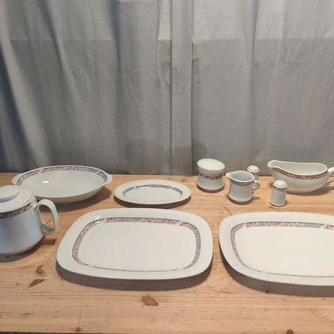 Muotisuunnittelija Lars Wallinin suunnittelema "Anniversary" astiasto. Valkoisella pohjalla herkkä, pitsimäinen kukkakuviointi. Myynnissä 3 lautasta. 2 kpl halkaisijaltaan 22 cm ja 2 kpl 27,5 cm.