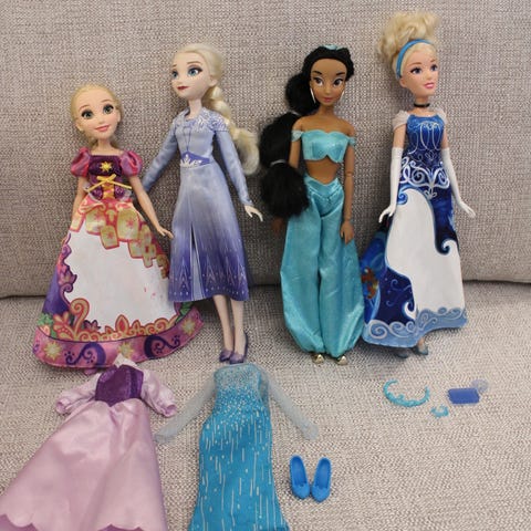 Aladdin on vanhempi, ihan hyväkuntoinen nukke, Jasmin taas uudempi ja aivan uuden veroinen. Alkuperäinen kampaus tallella, samoin kengät ja tiara.