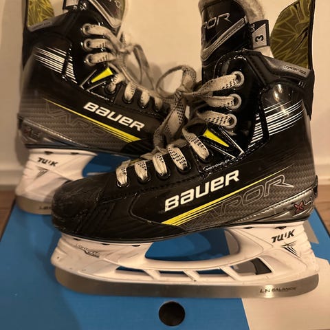 Toimivat nuorten luistimet. Etuläppien sisäpinta repsottaa, näkyy kuvissa. Muuten ehjät. Terämuovit juuri vaihdettu. Kahdet terät, molemmat vielä korkeita. Koko 5, Fit3.