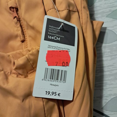 Uutta vastaavat, koko 164. Takana heijastimet, tarralla säädettävä vyötärö ja vetoketjutasku.