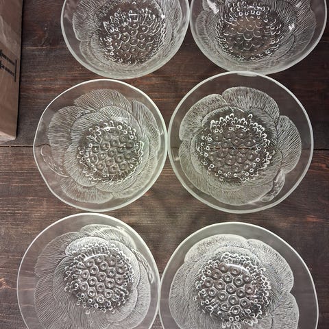 Iittala Nuutajärven Oiva Toikan Pioni-sarjan jälkiruokakulhoja 4 kpl. Harvinaisempi isompi malli, halkaisija reilut 14 cm (ks. kuva). Muissa ilmoituksissani myös pienempiä Pioni-kulhoja ja -laseja.