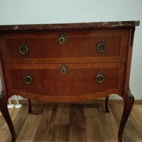 Maalattu valkoinen puinen lipasto, jossa on neljä laatikkoa. Kustavilainen tai kustavilaistyylinen. En tiedä lipaston taustoja tarkemmin, mutta olen ostanut sen Helsingin antiikkimessuilta, ruotsalaiselta antiikkiliikkeeltä. Lipastossa näkyy käytön jälkiä, mutta se on kaunis ja siinä on tyylikkäät yksityiskohdat. Avainta ei ole.