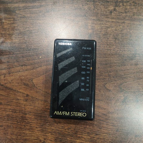 Kannettava hätäradio, joka on täysin ehjä ja toimiva. Paristot eivät tule mukaan.