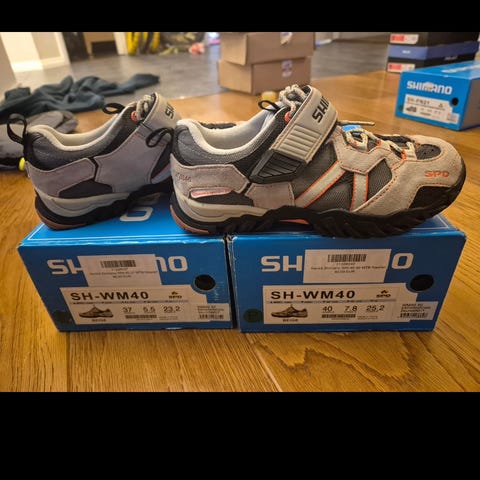 Naisten Shimano CW40 Click'R pyöräilykengät, koko 41. Vastaa aika hyvin kokomerkintää. Menee myös sirojalkaiselle miehelle. Vähän käytetyt, erittäin hyväkuntoiset. Kevyet ja mukavat jalkaan. Uudet SPD-klossit, mukana myös muovilevyt tavallisia polkimia varten. Spinningiin ja maastopyöräilyyn.