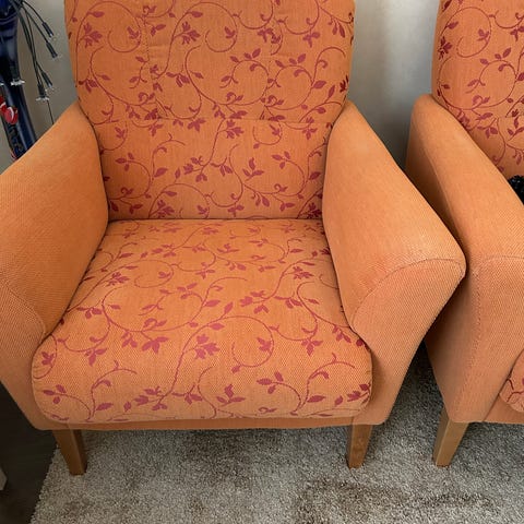 Vaaleanharmaa nojatuoli, jossa on suorakulmainen muotoilu ja pehmustetut istuin- ja selkätyynyt. Verhoilumateriaali on vaalea kangas. Istuinmukavuus ja tukevuus sopivat olohuoneen tai muun oleskelutilan kalusteeksi.